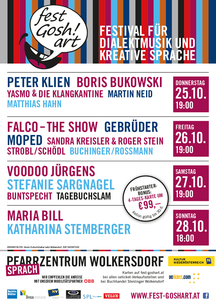 Als ich ins Foyer eintrete, verkündet bereits eine Glocke den Beginn des ersten Konzertes. Das „fest Gosh!art“, ein viertägiges Festival für Dialektmusik und kreative Sprache fand im Pfarrzentrum Wolkersdorf statt, das kurzerhand in Sprachzentrum umbenannt und umgestaltet wurde. Ein bisschen Retro-Optik blieb an manchen Ecken noch sichtbar, aber entgegen den Erwartungen gibt diese der Location keinen provinziellen Eindruck, sondern verleiht zusätzlichen Charme, außer vielleicht das Kreuz im Veranstaltungssaal.